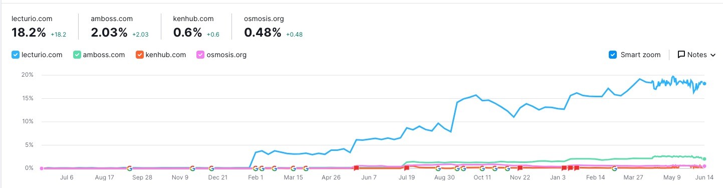 Through a strategic SEO approach, comprehensive content optimization, and continuous technical improvements, Lecturio achieved a 1976.32% increase in traffic over three years (from 400k/year to 10m/year in 3 years growth). The implementation of programmatic SEO, enhanced content strategy, and effective link-building were key to this success.