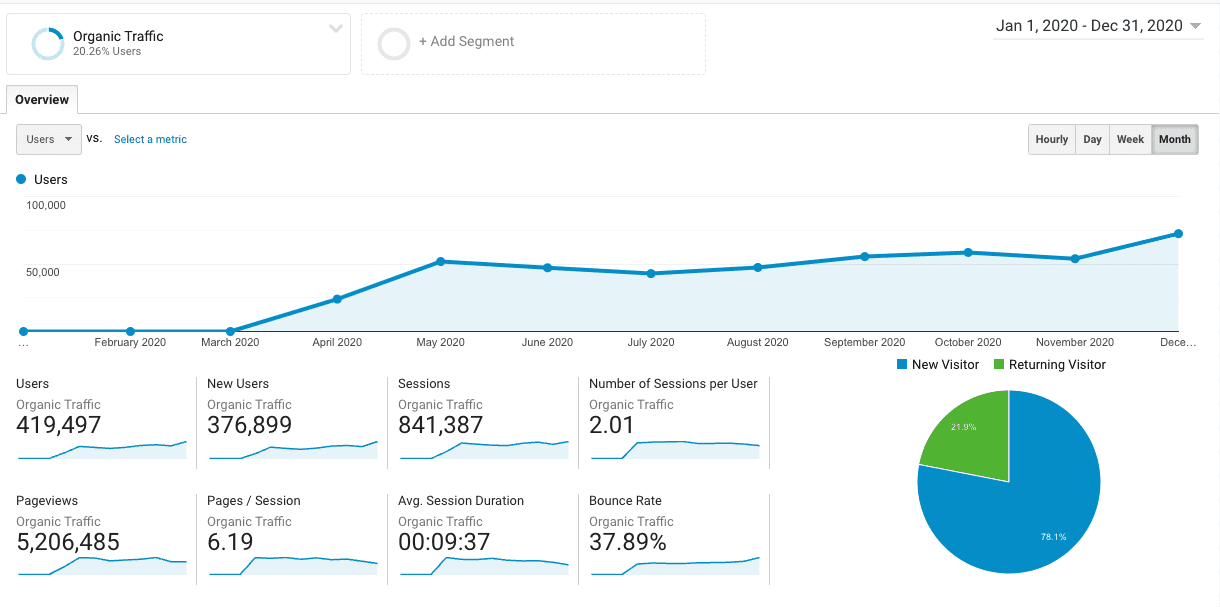 Primary Goal: Increase organic traffic by 100% YoY. We achieved this within the first 12 months (Feb 2020 to Feb 2021) and doubled it by 2022.