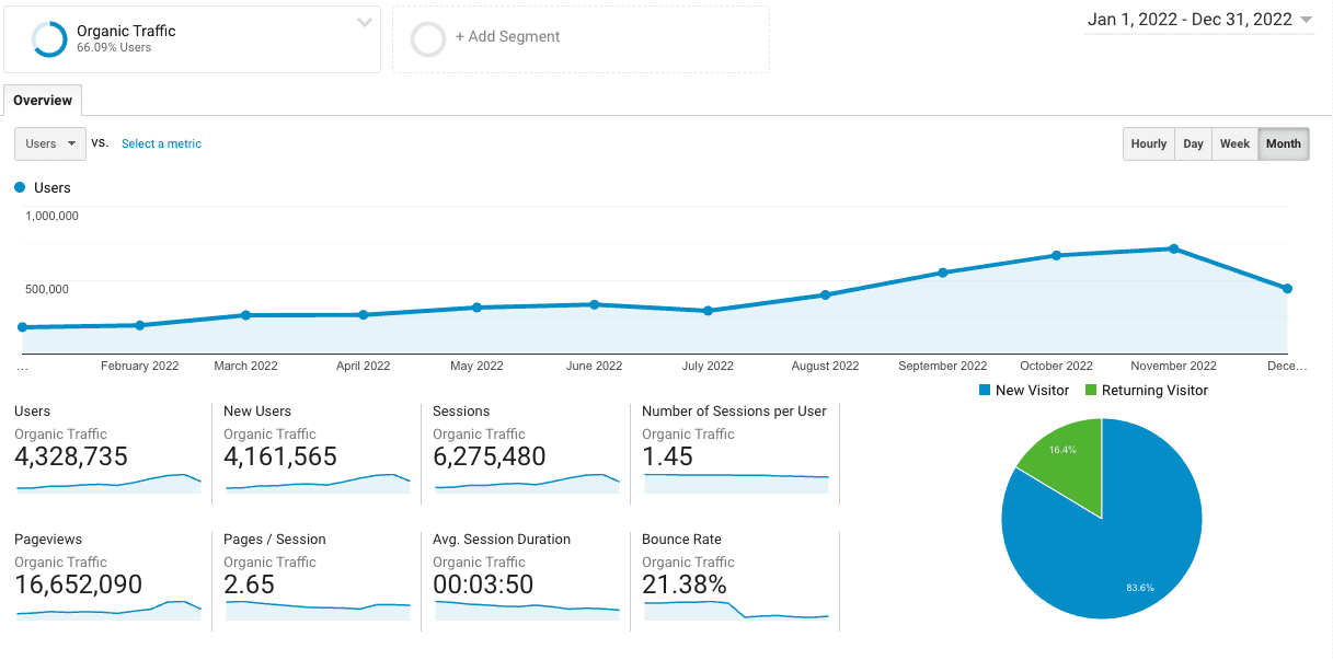 2022: 6,275,480 Organic Sessions (123.39% increase)