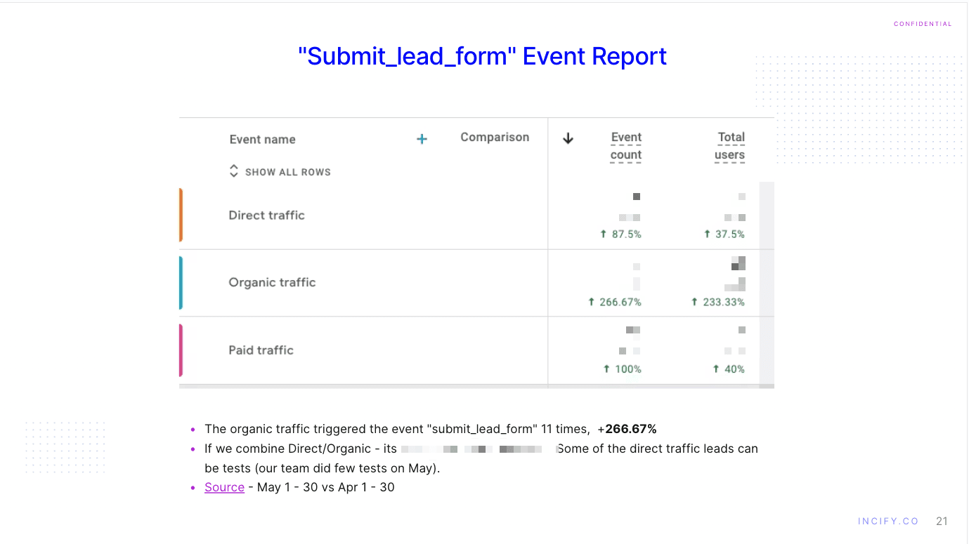 +266% Increase in Qualified Organic Leads: Translating into 20 new, product-related inquiries in just one month. (Add screenshot here of the GA4 event report for "submit_lead_form" showing the 266% MoM increase.)