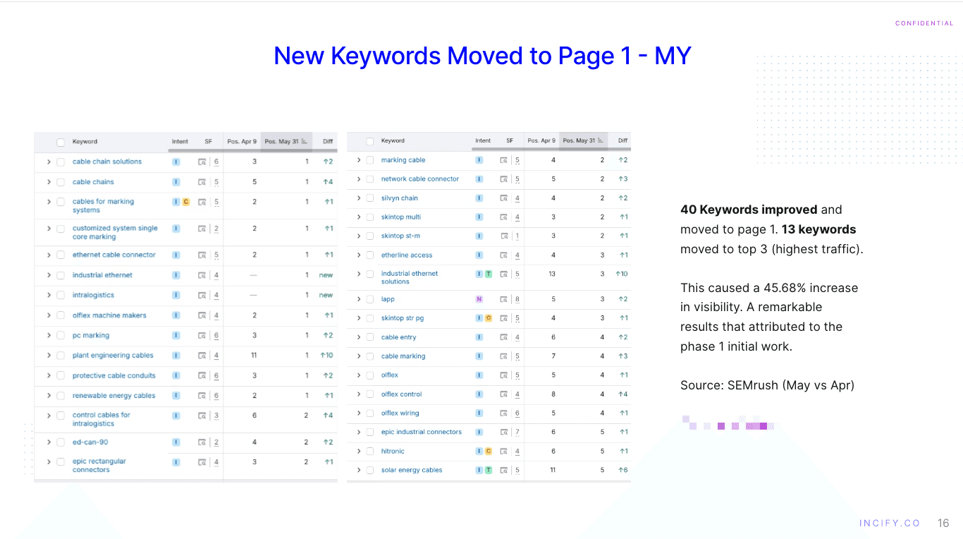 From near‑invisible to 50 % Page‑1 share, +31 % organic traffic, and +270% in organic RFQs, in 3 months.