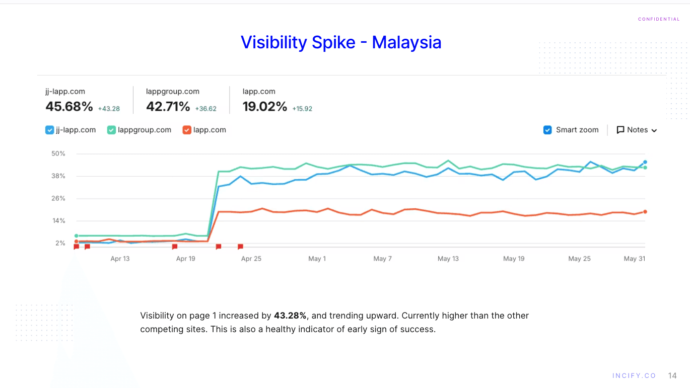 Explosive Market Visibility: We achieved a +45% visibility increase in Malaysia and +39% in Singapore, blowing past key competitors. (Add screenshot here of the SEMrush visibility trend graph for Malaysia or Singapore.)