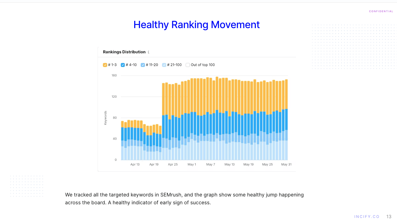 Dominant Search Rankings: We catapulted 30 high-intent keywords to the Top 3 positions and pushed over 70 more to Page 1. (Add screenshot here of the SEMrush keyword ranking distribution chart showing the growth in Top 3 keywords.)
