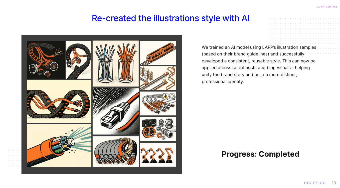 Launched AI-Powered Visuals: To create on-brand visuals at scale, we trained a custom AI model on JJ-LAPP's brand guidelines. This allows us to turn any image into a unique, brand-aligned illustration instantly, cutting time and costs.