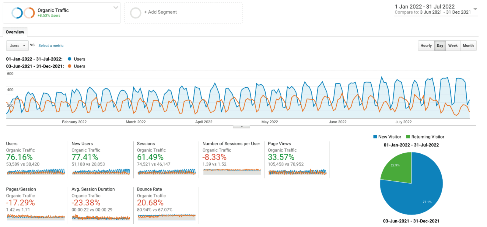 In just 6 months, we helped the client to achieve a 76.16% increase in organic traffic and grew their monthly leads from 20-25 to 70-75 per month (source: Hubspot new contacts logged into the system, attributed to organic channel). Here’s a look at how we made it happen.