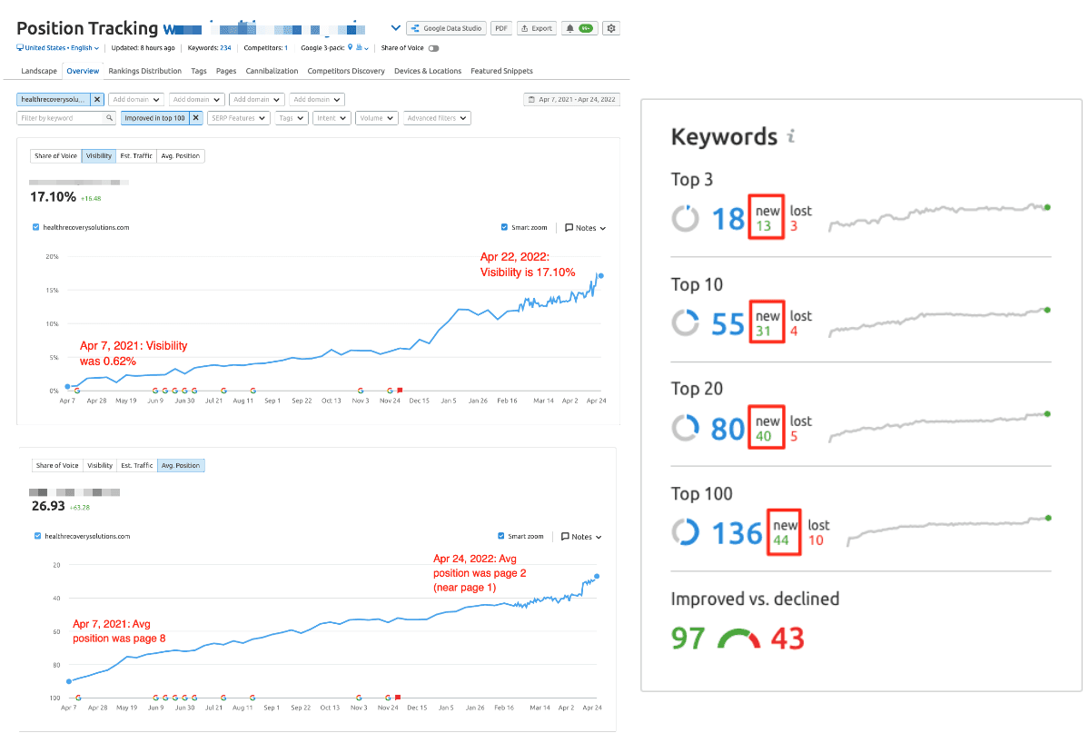 Increase Visibility: Improve visibility metrics, aiming to push key healthcare keywords to top positions and to rank for the prime keywords we set during the assessment stage.
