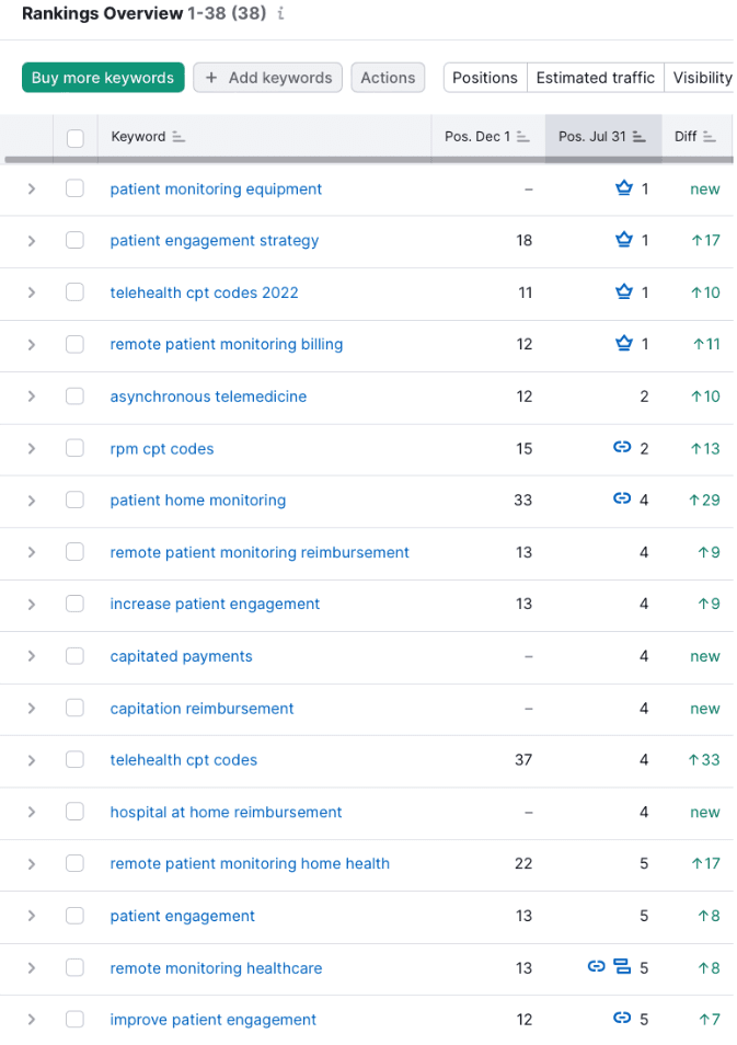 Ranking for Key “Money” Keywords: We pushed 31 new keywords to the top 10, including critical terms like “RPM devices,” “remote patient monitoring systems,” and “patient engagement strategy.”